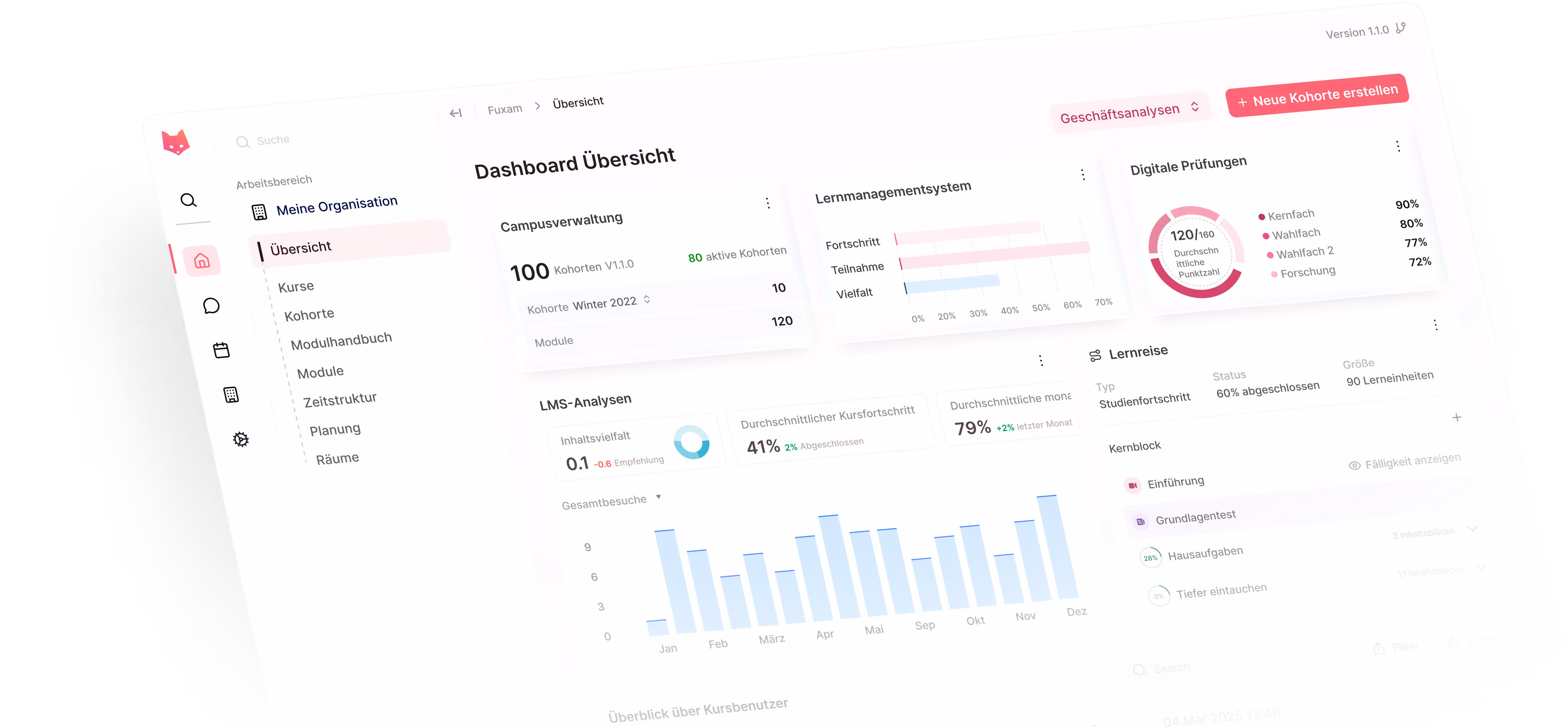 FuxamOne steht für moderne Bildung und passt sich jeder Institution an – ob Universität, Berufsschule oder Akademie. Eine vollständig modularisierbare Software, unabhängig von Art und Größe der Bildungseinrichtung.